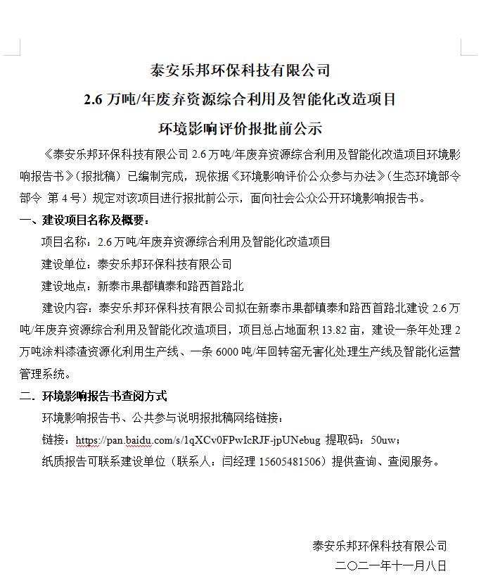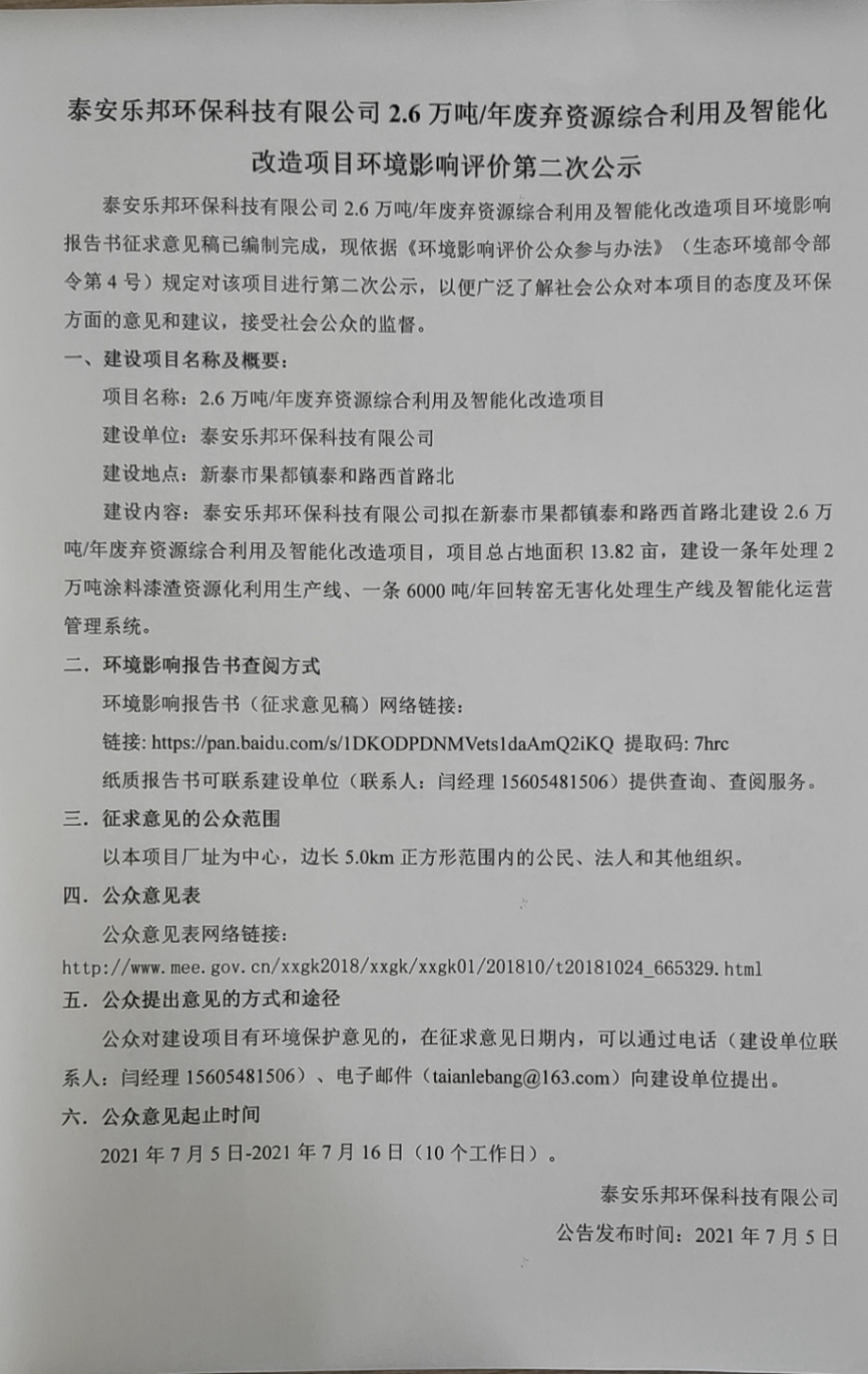 泰安樂邦環(huán)保科技有限公司2.6萬噸/年廢棄資源綜合利用及智能化改造項目環(huán)境影響評價第二次公示