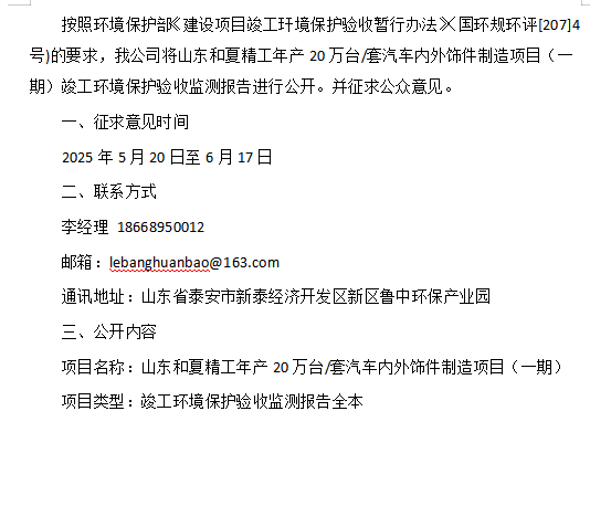 山東和夏精工年產(chǎn)20萬臺/套汽車內(nèi)外飾 件制造項目(一期)竣工環(huán)境保護驗收監(jiān)測報告表